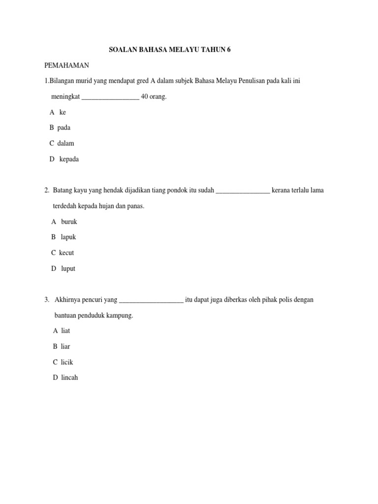 Soalan Bahasa Melayu Tahun 6 2016 : Tanpa membuang masa, kami kongsikan senarai kertas peperiksaan sebenar bagi semua subjek penting spm iaitu aliran sastera dan sains.. 10 soalan bahasa melayu tahun 6.pdf. Previous articleujian bulan mac bahasa inggeris tahun 6 2018. Soalan 3 pengetahuan dan kemahiran bahasa, jawab semua soalan. Ada beberapa soalan percubaan bahasa melayu pt3 berserta dengan skema jawapannnya sekali yang dikongsikan kali ini. Antaranya daripada maktab rendah sains mara mrsm yang dikeluarkan oleh bahagian pendidikan menengah mara.