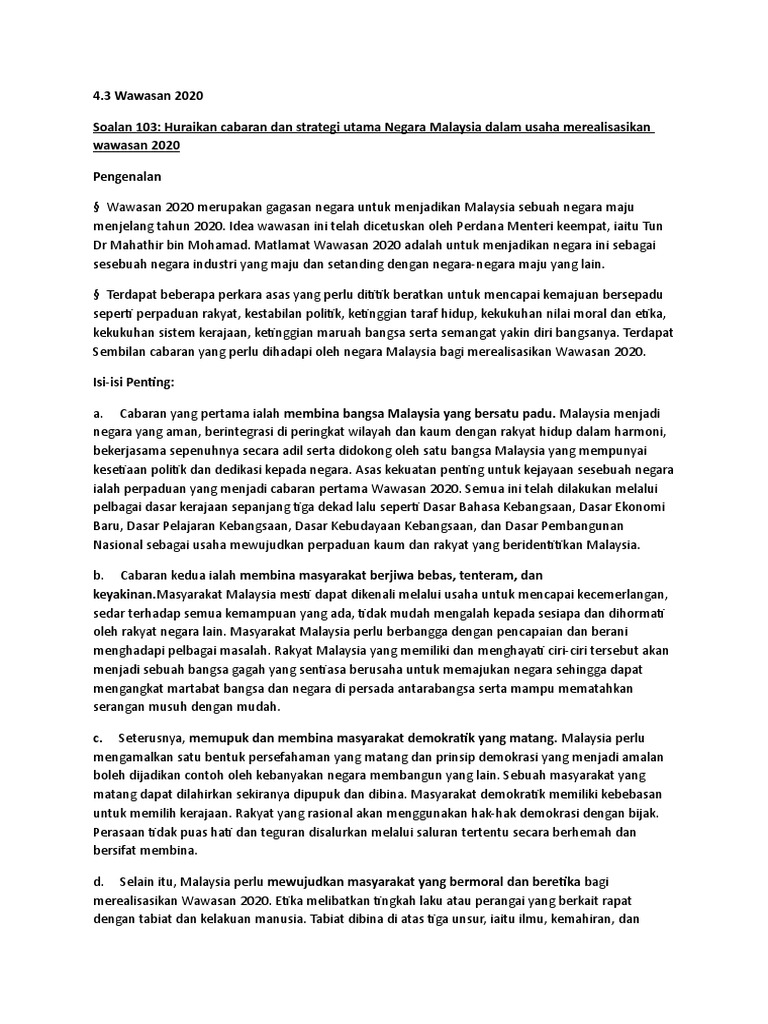 Kaedah wawasan 2020 dapat dicapai. Huraikan cabaran dan strategi utama negara malaysia dalam usaha merealisasikan wawasan 2020. Wawasan 2020 mengandungi sembilan cabaran yang merangkumi semua aspek kehidupan daripada segi moral, ekonomi, politik dan sosial. Wawasan 2020 diperkenalkan oleh tun dr mahathir mohamad. Inilah menyebabkan kita akui tidak mencapai wawasan 2020, tambahnya lagi.