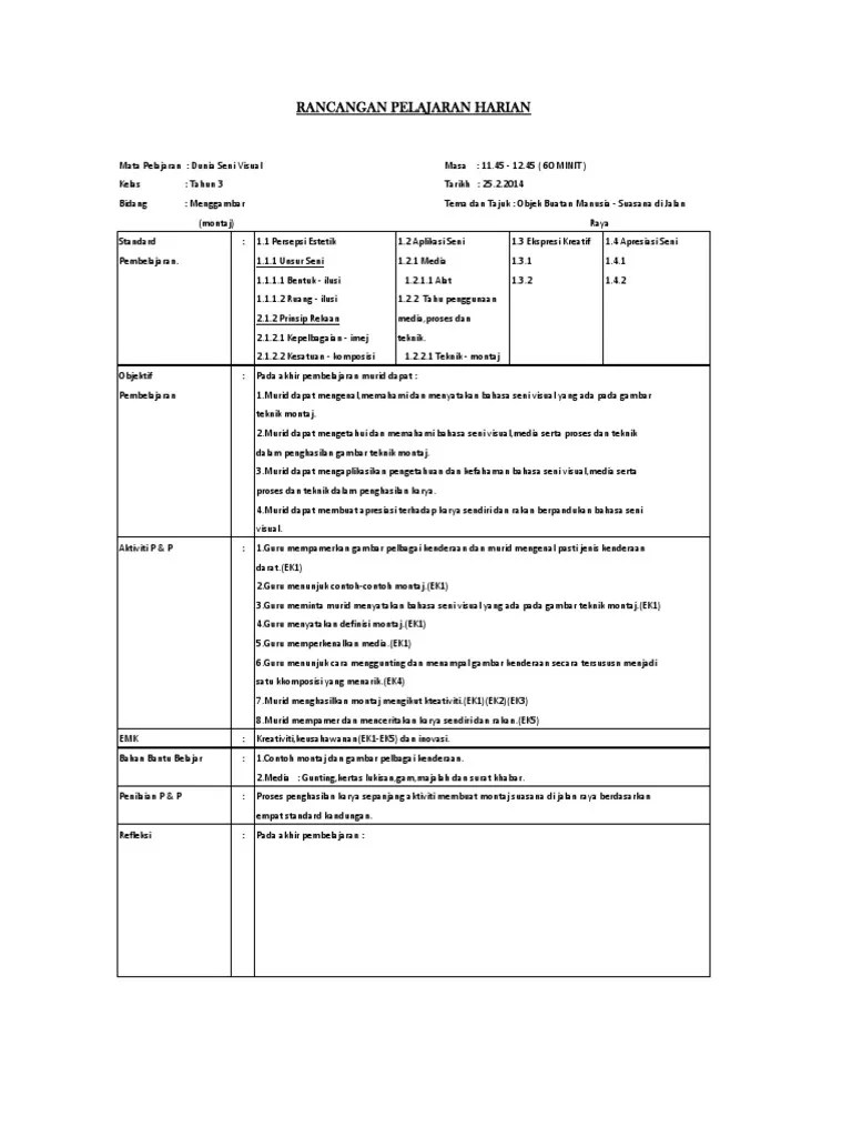 Rancangan pengajaran harian pendidikan seni visual nama: Rph moral tahun 1 baik hati; Rancangan pengajaran harian kssr seni tahun 4. Rancangan pengajaran harian dsv tahun 3 21 refleksi ditulis selepas pdp dijalankan. Keluarga bahagia fokus utama :