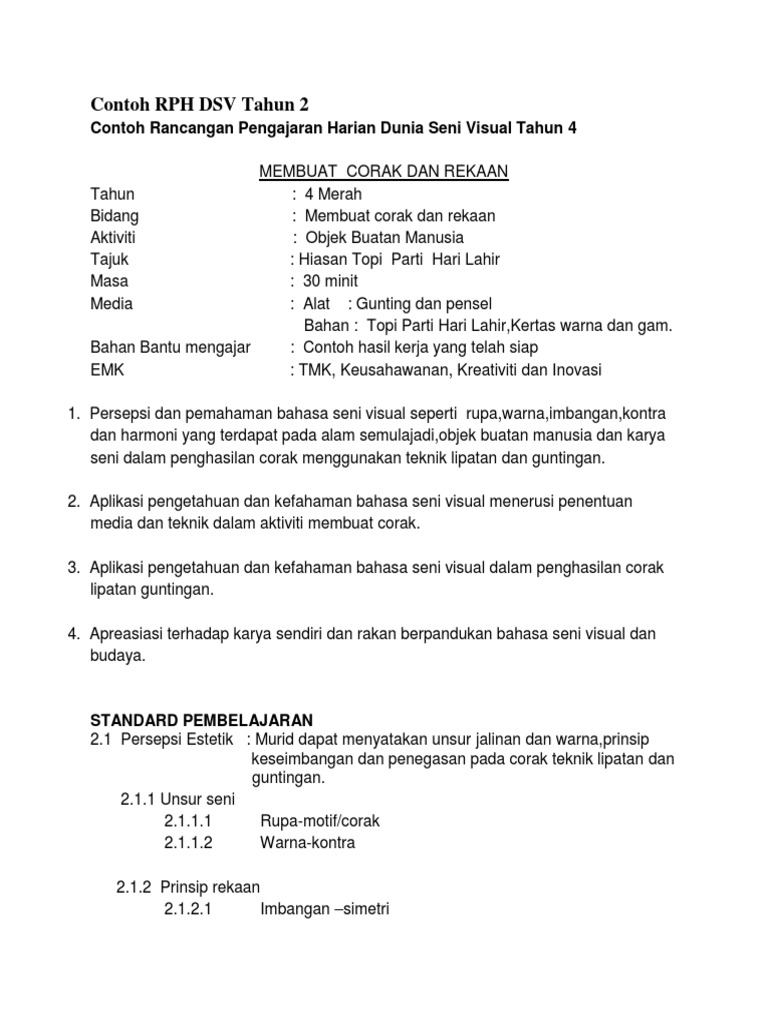 Rph Dsv Tahun 4 Cetakan from img.dokumen.tips Rancangan pengajaran harian pendidikan seni visual nama: Hubungi telegram di bawah untuk dapatkan rph ini. Seni di sekeliling ku tajuk : Instrumen penilaian bahasa kemahiran membaca; Rph psv tahun 4 membuat corak dan rekaan koleksi rph pendidikan seni visual tahun 4 sekolah rendah pelbagai subjek dan tahun sebagai panduan kepada guru merancang aktiviti pdp setiap hari. Rancangan pengajaran harian dsv tahun 3 21 refleksi ditulis selepas pdp dijalankan. Berikut merupakan koleksi rph tahun 4 bagi mata pelajaran pendidikan seni visual. Copy paste daripada fb anda buat anda dapat.